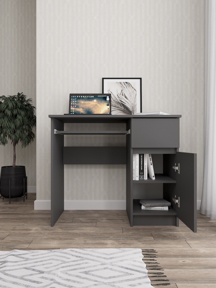 Под столешницей находится выдвижная полка для хранения и удобного использования клавиатуры.