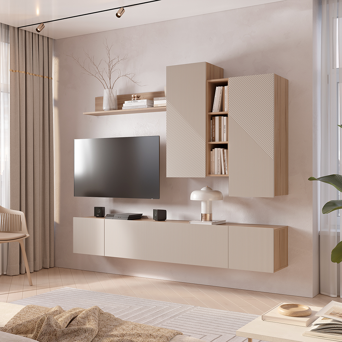 Гостиный модуль "Эмилия" ГМ-12 включает в себя ассиметричные шкафчики и длинную стильную рейку, что придает дизайну коллекции индивидуальность. В шкафчиках находится по две вместительных полки, а между ними расположены открытые узкие полки, которые идеально подойдут для хранения сувениров и элементов декора.