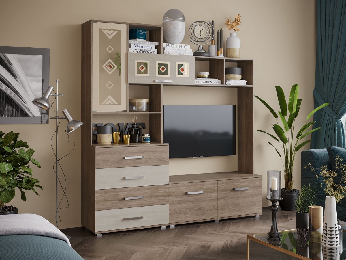 Центральная секция состоит из комода с четырьмя выдвижными ящиками, тумбы под ТВ с диагональю до 40 дюймов, а также множества закрытых и открытых полок для различных мелочей.