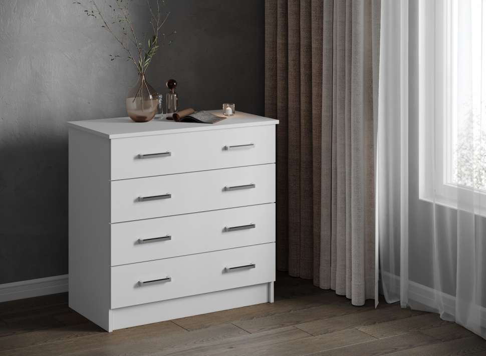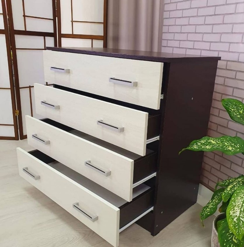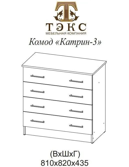 Комод Катрин-3 бренда “ТЕКС” - это универсальный вид мебели, который подходит для любых помещений и любых целей. Он служит для хранения белья и других домашних вещей. Состоит из четырёх выдвижных ящиков, установленных на роликовых направляющих, расположенных друг над другом. Максимальная распределенная нагрузка для выдвижных ящиков на дно — 8-10 кг.