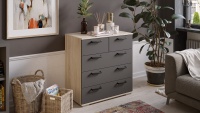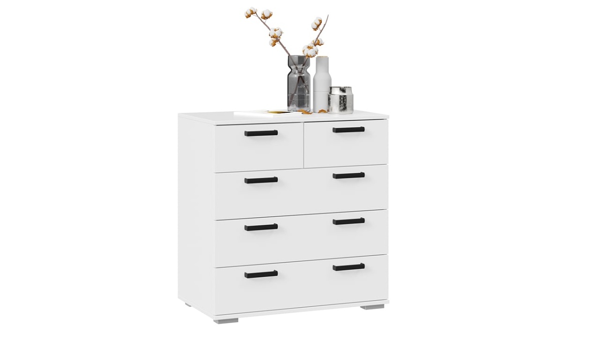 Комод имеет небольшие габариты и выглядит компактно, но имеет 5 вместительных выдвижных ящиков, которые позволят использовать 100% внутреннего пространства. Их можно использовать для хранения одежды, постельных принадлежностей, полотенец, а также для всевозможных мелких предметов, украшений и прочего.