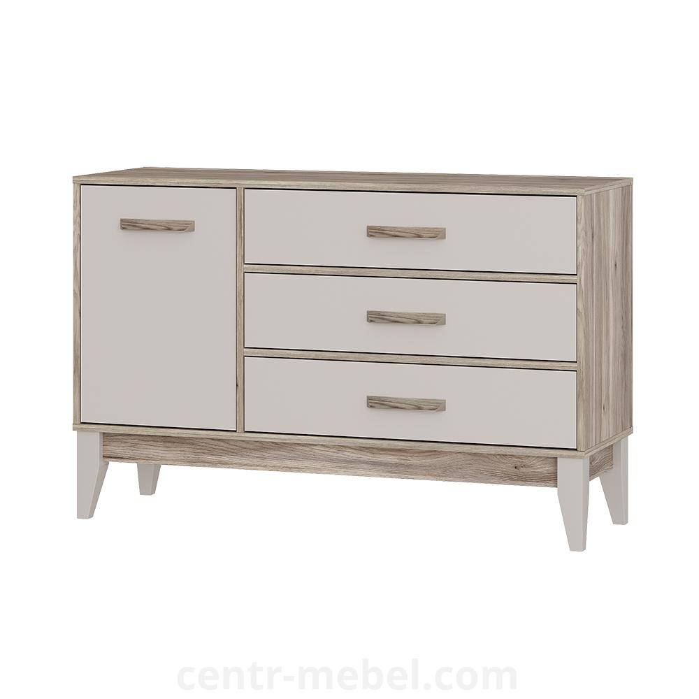 Комод «Скандика» КМ-12 – это не только вместительная, но и стильная модель, которая украсит вашу гостиную или спальню. Полка за дверцей подойдет для хранения важных мелочей, небольшой техники, фотоальбомов. Три просторных ящика позволят удобно рассортировать белье и одежду.