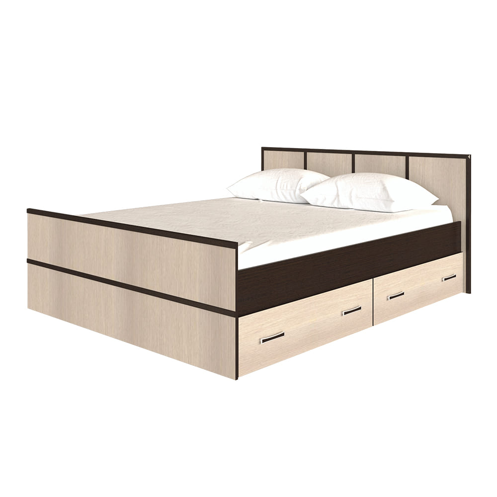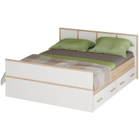 - Кровать оснащена двумя вместительными ящиками для постельных принадлежностей. Конструкцией предусмотрено, что ящики выдвигаются на роликах - опорах. Дном кровати служат проложки из ЛДСП, на которые вы можете положить матрас удобной для вас высоты (проложка в комплект не входит!)