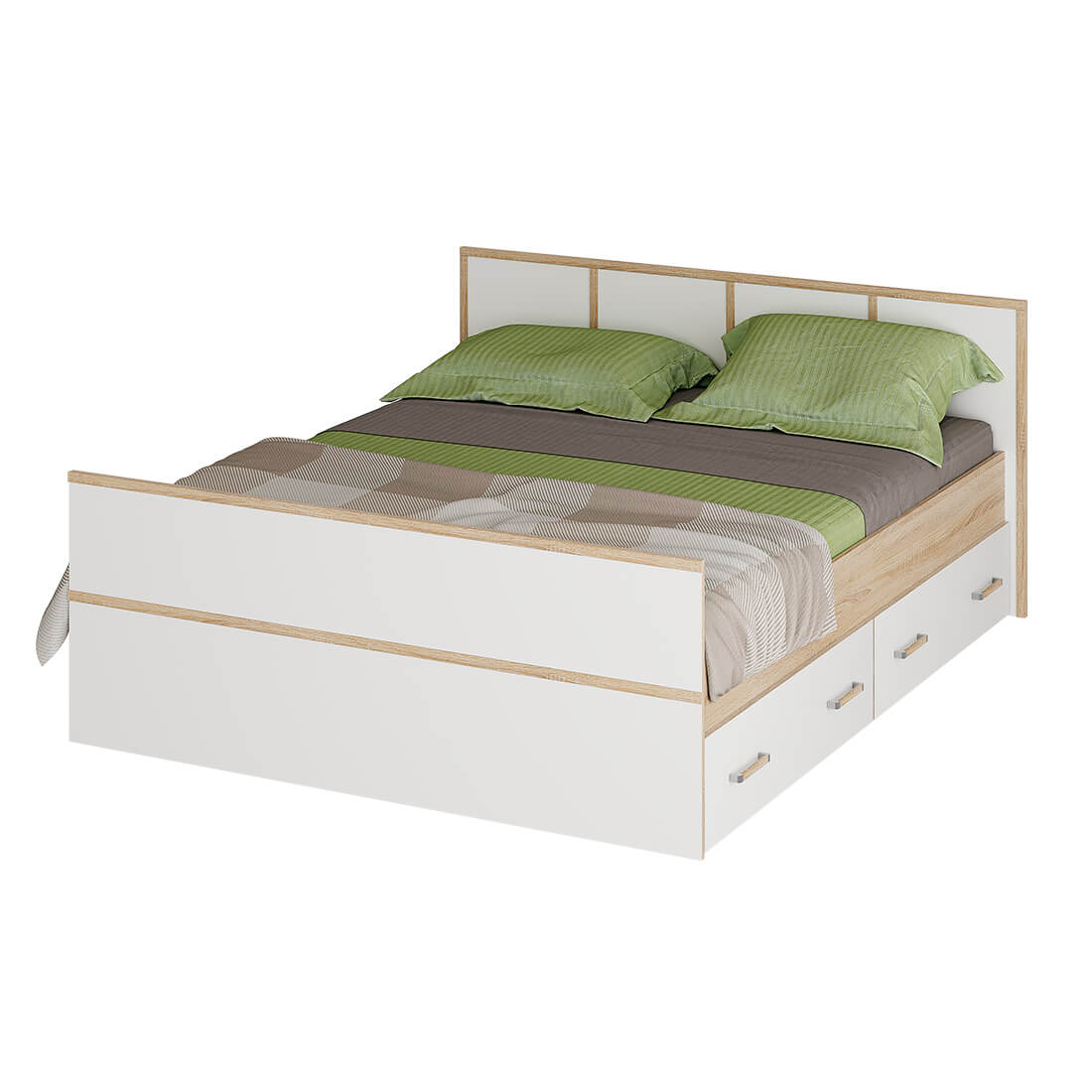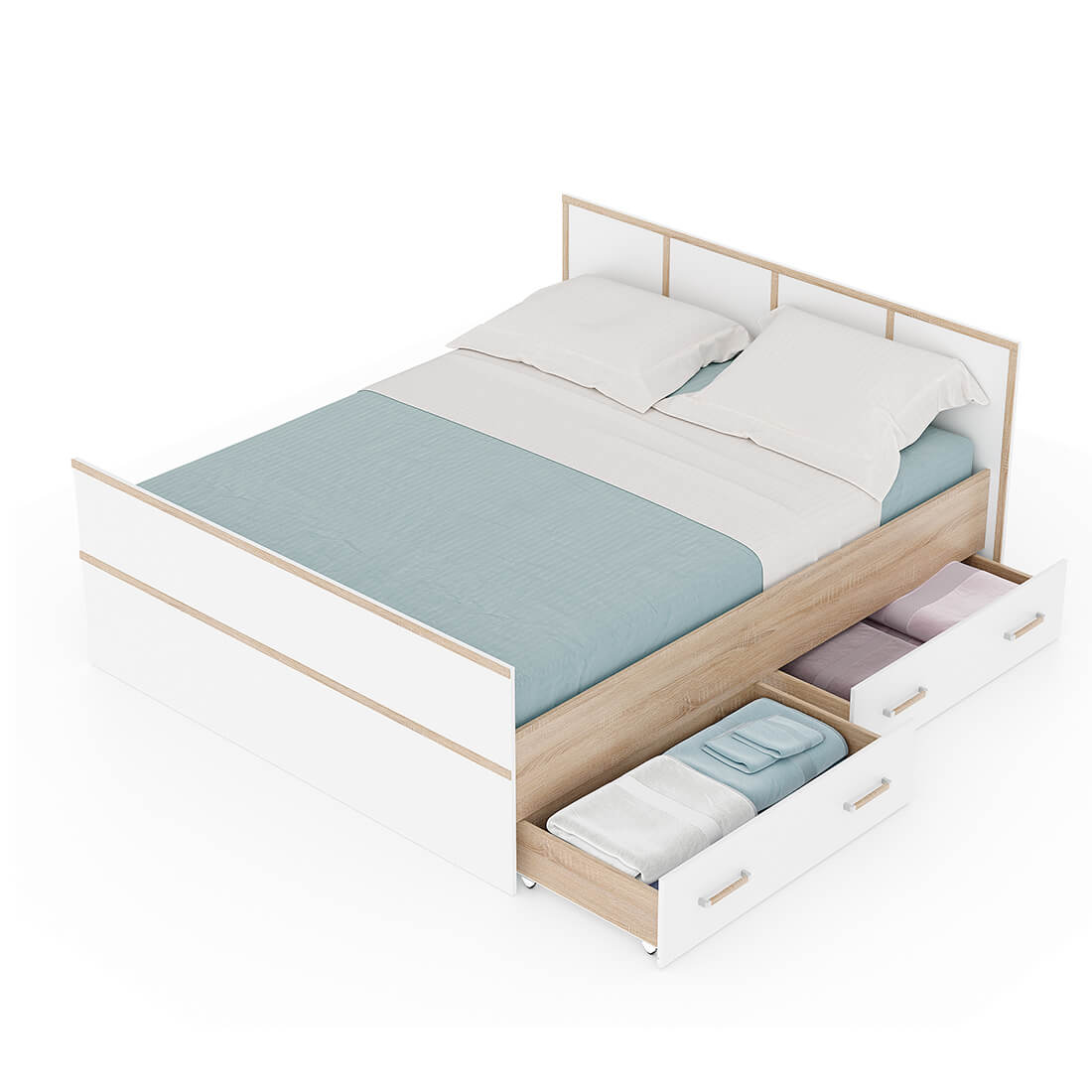 Кровать оснащена двумя вместительными ящиками для постельных принадлежностей. Конструкцией предусмотрено, что ящики выдвигаются на роликах - опорах. Дном кровати служат проложки из ЛДСП, на которые вы можете положить матрас удобной для вас высоты (проложка в комплект не входит!) Матрас приобретается отдельно!