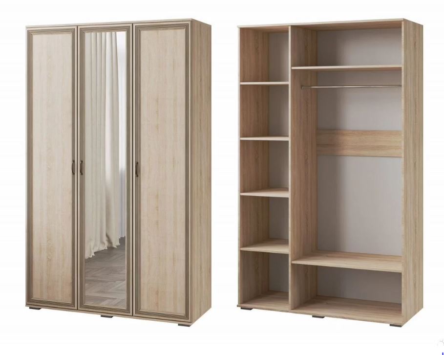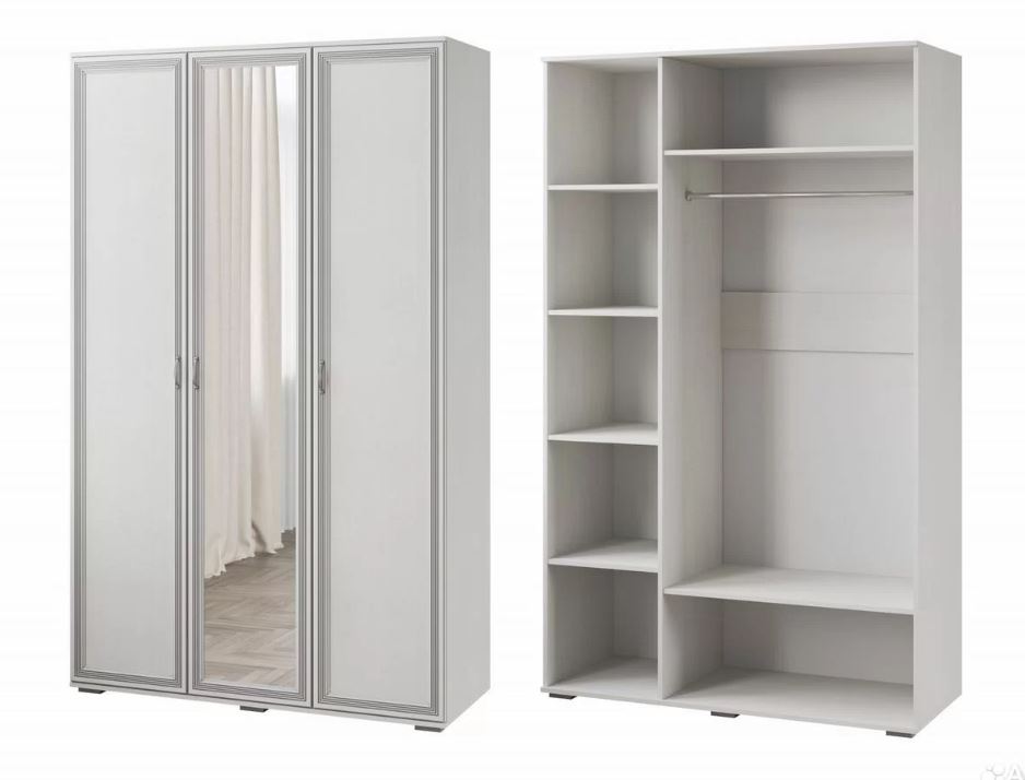 Вместительный трехдверный шкаф с продуманным функционалом поможет сэкономить пространство и придаст помещению современный вид. Шкаф оснащен отделением с четырьмя полками для хранения белья и стационарной металлической штангой для размещения одежды на плечиках. Центральный фасад с зеркалом в полный рост позволяет увидеть свое отражение без помех. Изнутри зеркало покрыто специальной защитной пленкой, которая в случае повреждения стекла сохранит каждый его кусочек.