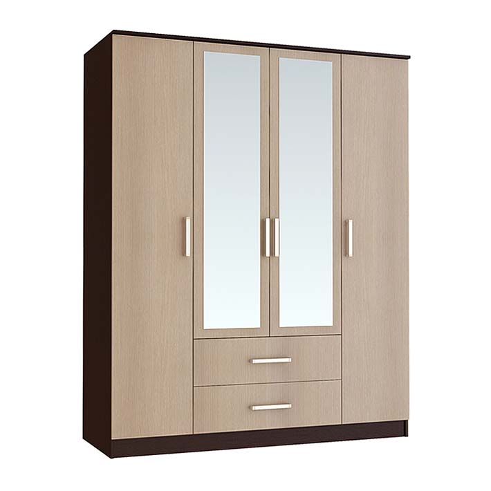 Шкаф 4-х створчатый декорирован двумя зеркалами с еврокромкой и двумя вместительными ящиками. Распашная система дверей скрывает платяной отдел с хромированной штангой и бельевой с обилием полок.