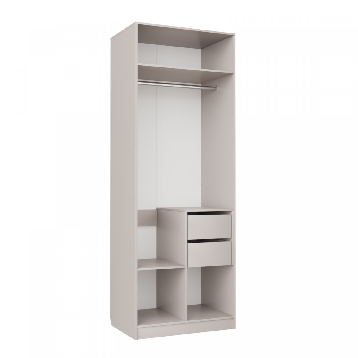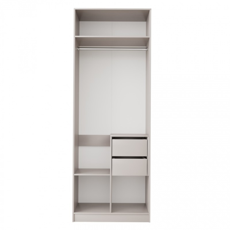 Шкаф комплектуется штангой для одежды и скрытой тумбой с ящиками.