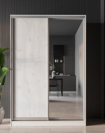Шкаф-купе «Мадрид» представляет собой сочетание практичности и функциональности. Одна из створок полностью декорирована зеркалом с еврокромкой. Внутри с одной стороны находятся пять просторных полок для хранения вещей и постельного белья, с другой стороны – вместительная зона хранения с горизонтальной хромированной штангой для одежды на вешалках. Сборка универсальная.