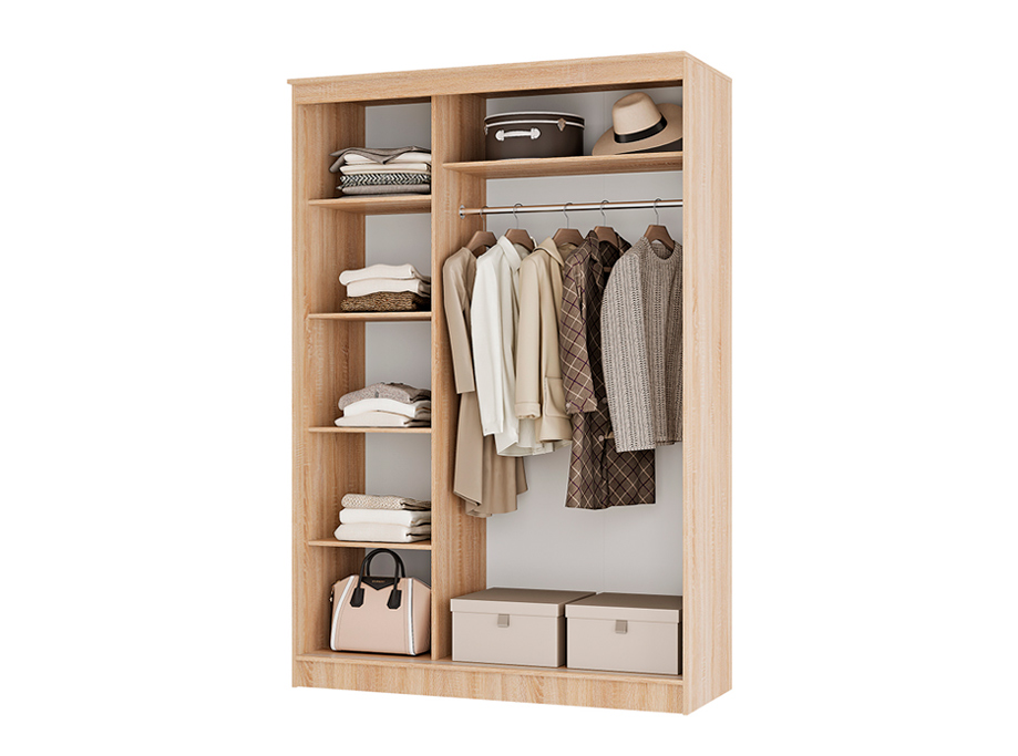 Шкаф-купе 1,5 декорирован зеркалом во всю величину створки и содержит платяное отделение с хромированной штангой и секцию для белья.