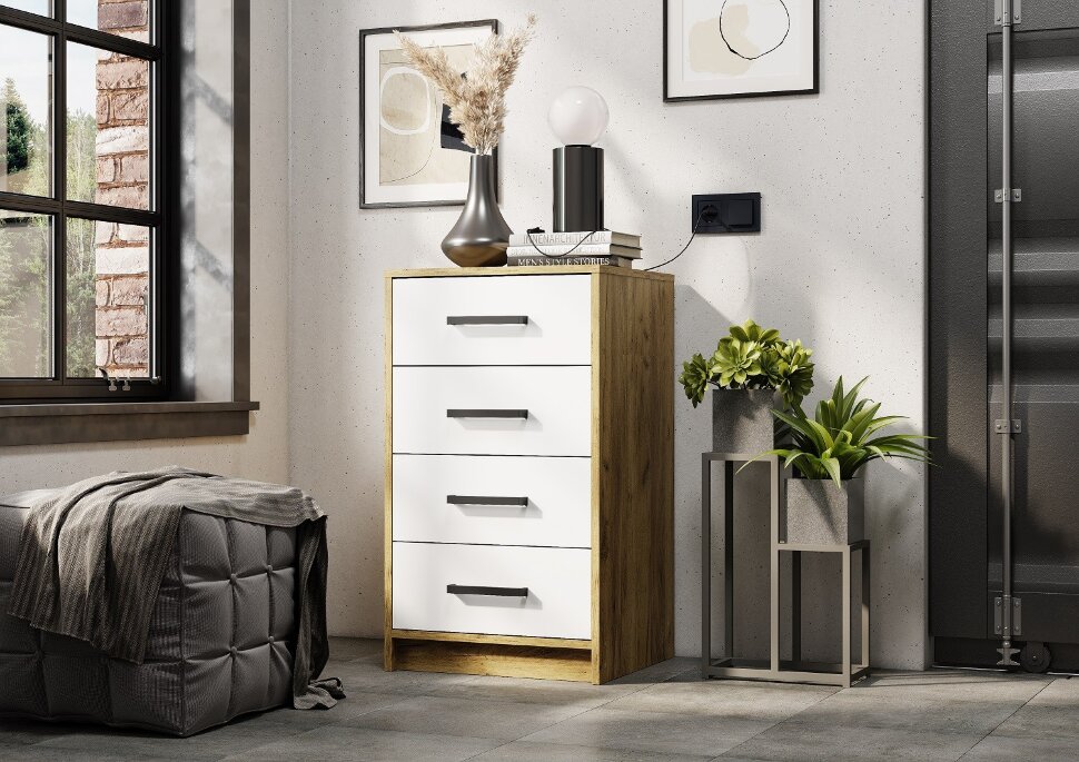 Высокий комод Мия отлично справится с вопросом хранения одежды в сложенном виде, вещей, постельного белья, игрушек, сезонных аксессуаров и всего того, что должно храниться в порядке. 4 выдвижных ящика оснащены роликовыми направляющими и удобными ручками. Регулируемые опоры позволяют установить комод даже на неровном полу. Особенности приятное цветовое решение с древесным рисунком компактный размер роликовые направляющие на ящиках максимальная нагрузка на ящик - 5 кг