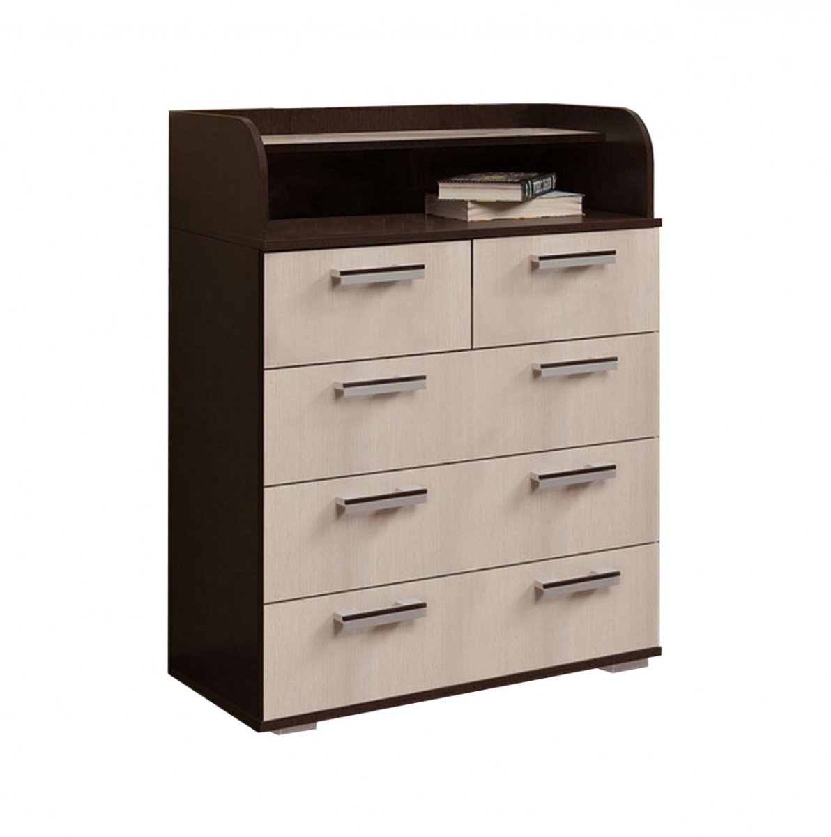 Эта модель оснащена пятью выдвижными ящиками на роликовых направляющих разных размеров и открытыми полками. Главная особенность комода "Стандарт-1" — это дополнительная надстройка на крышке, она значительно расширяет возможности практического использования, что позволяет организовать хранение аксессуаров, игрушек и одежды.